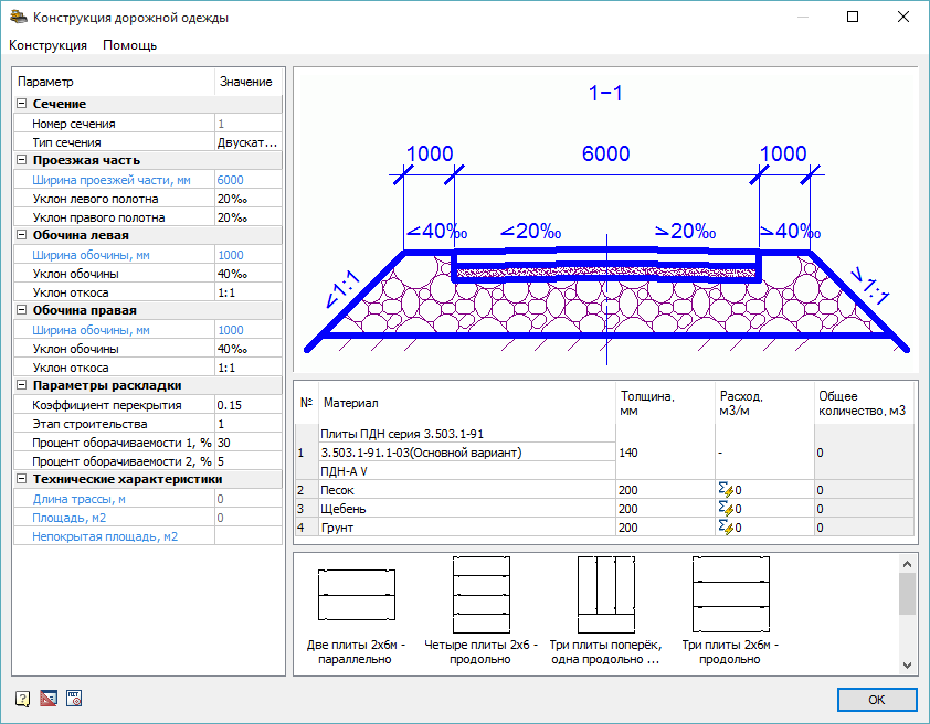 Программа содержит базу данных дорожных плит и различные схемы раскладки. Автоматически вычисляется расход дорожных плит и сыпучих материалов, необходимых для устройства временной дороги. Поддерживается возможность ассоциативного обновления раскладки плит при редактировании контура дороги. Модуль выполняет следующие функции:
