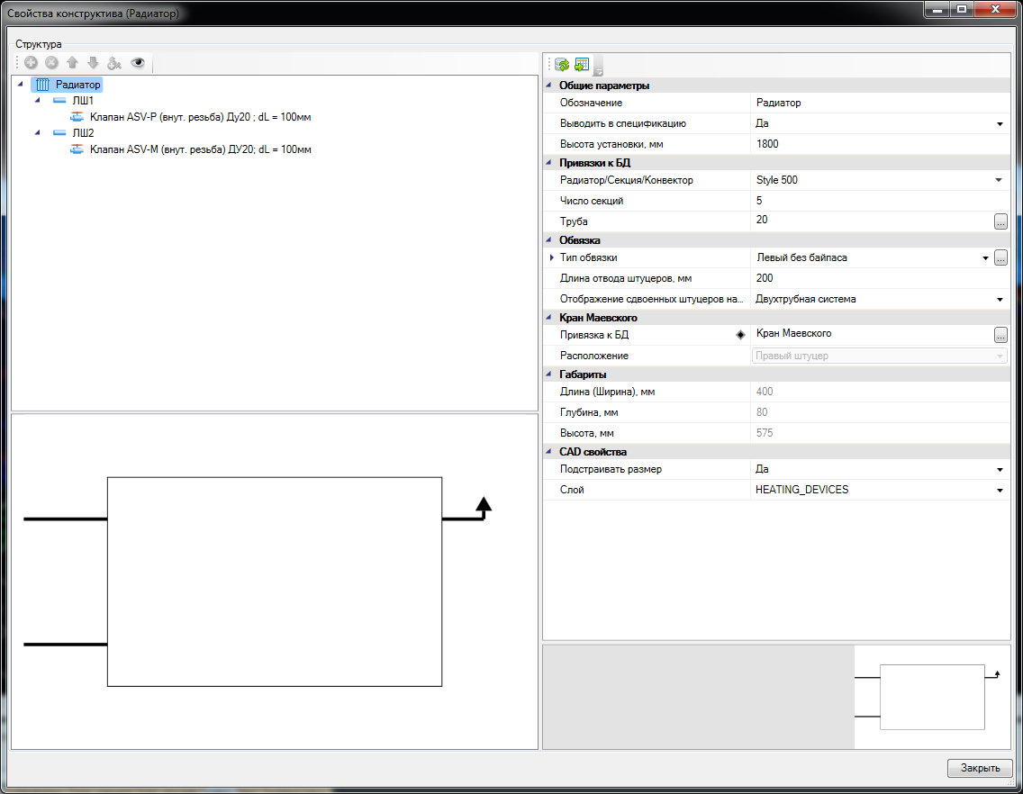 Все объекты nanoCAD Отопление (трубопроводы, отопительные приборы, трубопроводная арматура и т.д.) являются интеллектуальными. Любой из объектов обладает характерными для этого элемента свойствами, которые в процессе проектирования можно редактировать. Для каждой группы элементов данные свойства имеют определенные характеристики. Для трубопроводов можно выбрать сортамент и типоразмер, для отопительных приборов – типоразмер или количество секций и характеристики обвязки с учетом арматуры, а для трубопроводной арматуры – сортамент и типоразмер.