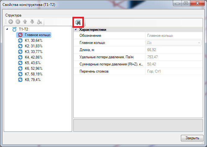 На странице свойств Вход в систему отопления можно увидеть список колец. Кроме того, имеется возможность визуализации кольца в расчетной модели. Также отображена разность увязки второстепенных колец с главным кольцом. Это позволяет увидеть кольца и найти нужное место установки балансировочной арматуры для увязки второстепенных колец с главным.