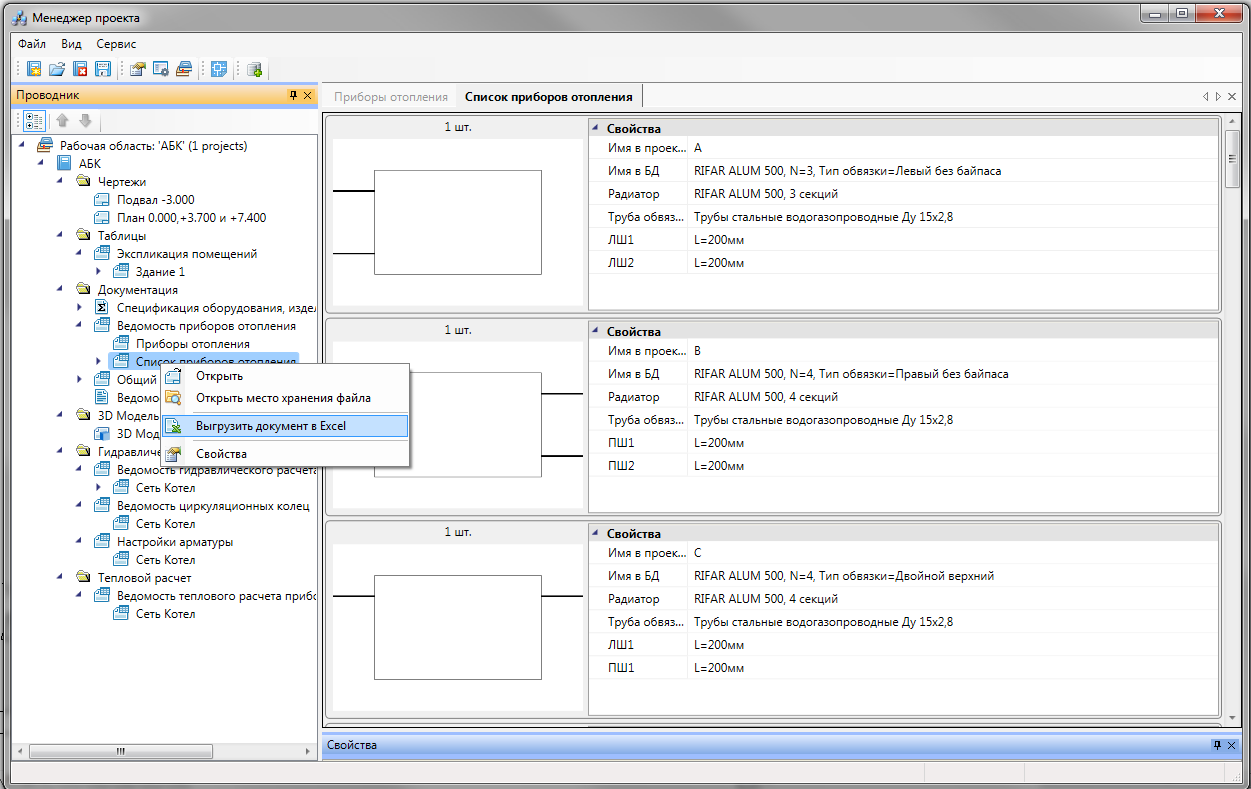 Реализован тепловой расчет систем отопления. В Менеджере проекта формируется ведомость теплового расчета приборов отопления, которую можно вывести в Excel.